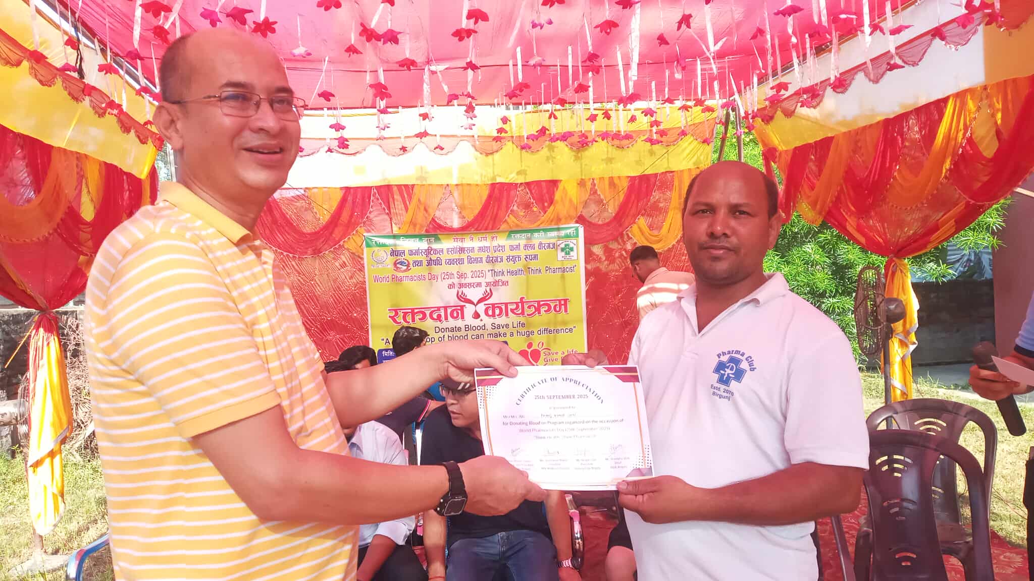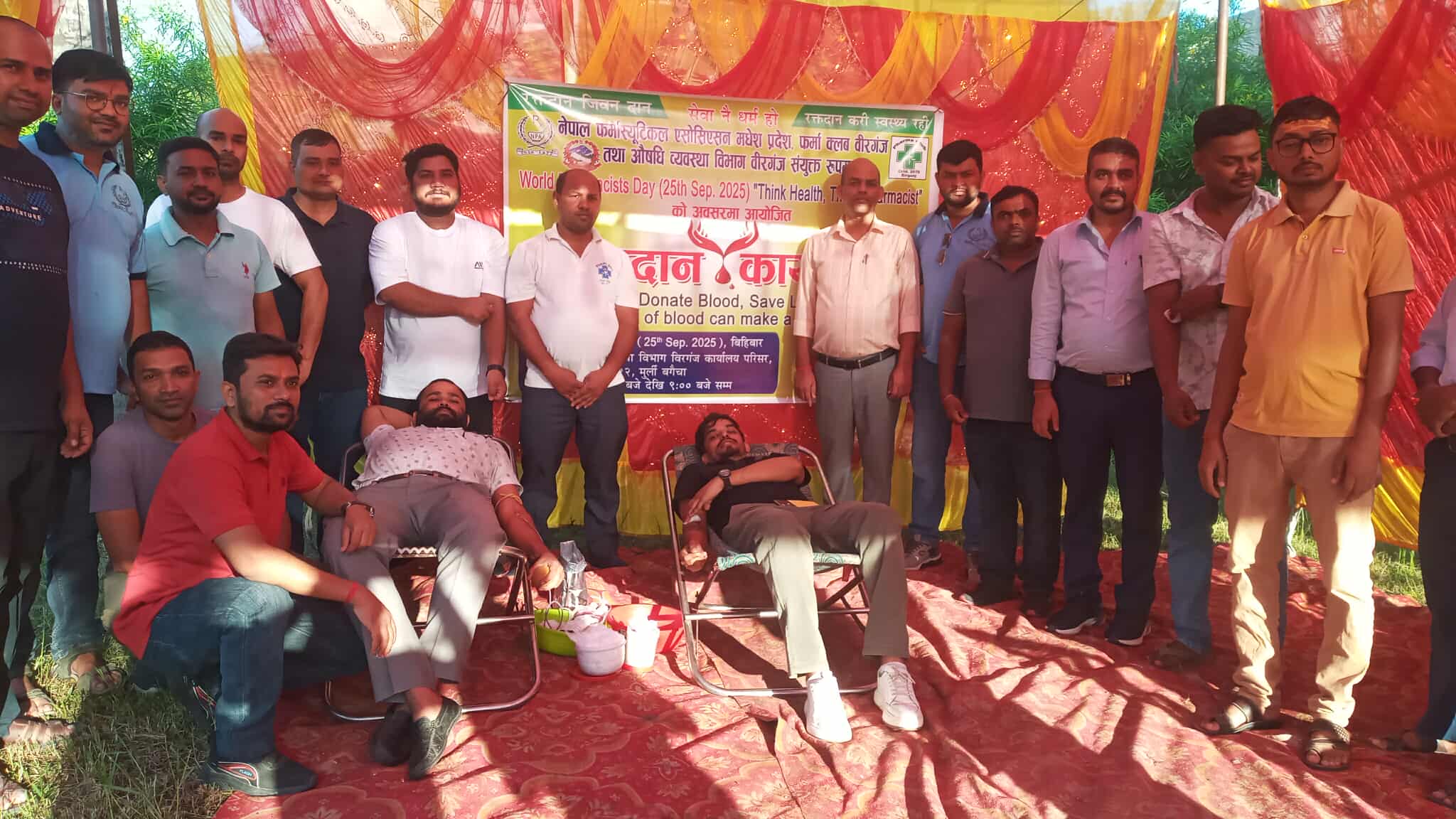 World Pharmacists Day हरेक वर्ष सेप्टेम्बर २५ तारिखमा मनाउने क्रममा यो वर्ष मानवीय क्षेत्रमा सहयोग पुराउने उदेश्यले खुल्ला रक्तदान कार्यक्रम आयोजना गरिएको फर्मा क्लब बीरगंजका अध्यक्ष निरज कुमार गिरिले जानकारी दिनुभएको छ। साथै उनले भने जसको उद्देश्य विश्वभरिका फार्मासिस्टहरूका योगदानलाई सम्मान गर्ने र औषधि सेवा प्रणालीमा उनीहरूको भूमिकालाई उजागर गर्नु रहेको बताएका छन् ।समाजको लागि पनि केही गर्नुपर्छ भन्ने हाम्रो उदेश्य रहेकोले आज खुल्ला रक्तदान कार्यक्रम सम्पन्न गरेको बताए । रक्तदान गर्नेहरु निरज कुमार गिरि,शशिकान्त ठाकुर , शशिकान्त चौधरी ,साजाद आलम,चन्दन चौरसिया,रामकिशोर पटेल ,रमन भुरेर यादव ,भूषण प्रसाद यादव लगायतले रक्तदान गरेको रक्त संचार केन्द्रका प्रविधिक जितेन्द्र कुशवहाले जानकारी दिनुभएको छ ।