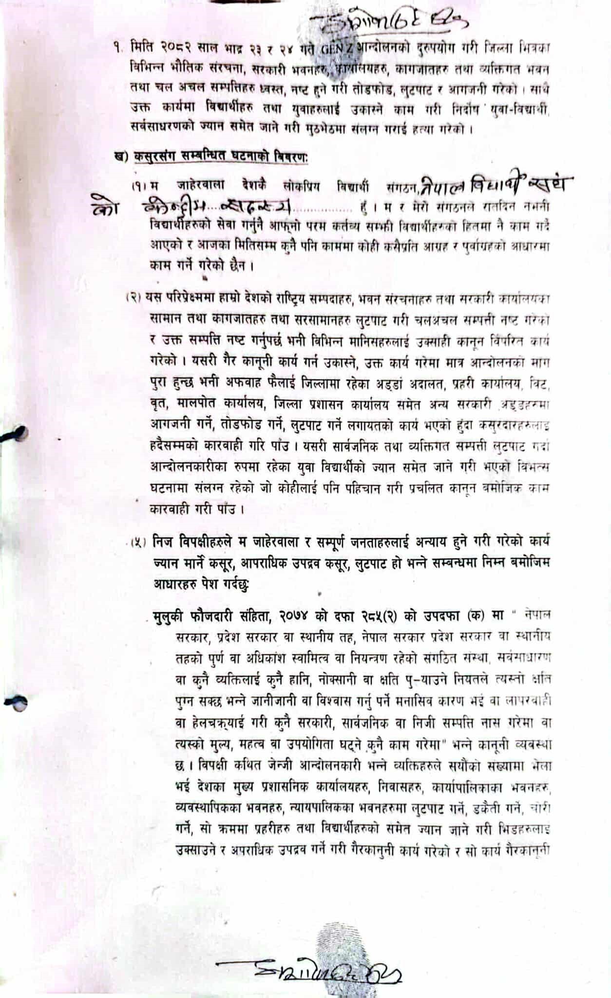 निजहरुले देशका राष्ट्रिय सम्पदाहरु, भवन संरचनाहरु तथा सरकारी कार्यालयका सामान र कागजातहरु लुटपाट गरी चलअचल सम्पत्ति नष्ट गरेको र र उक्त सम्पत्ति नष्ट गर्नुपर्छ भनि मानिसहरुलाई उक्साएको दावी गरिएको छ ।