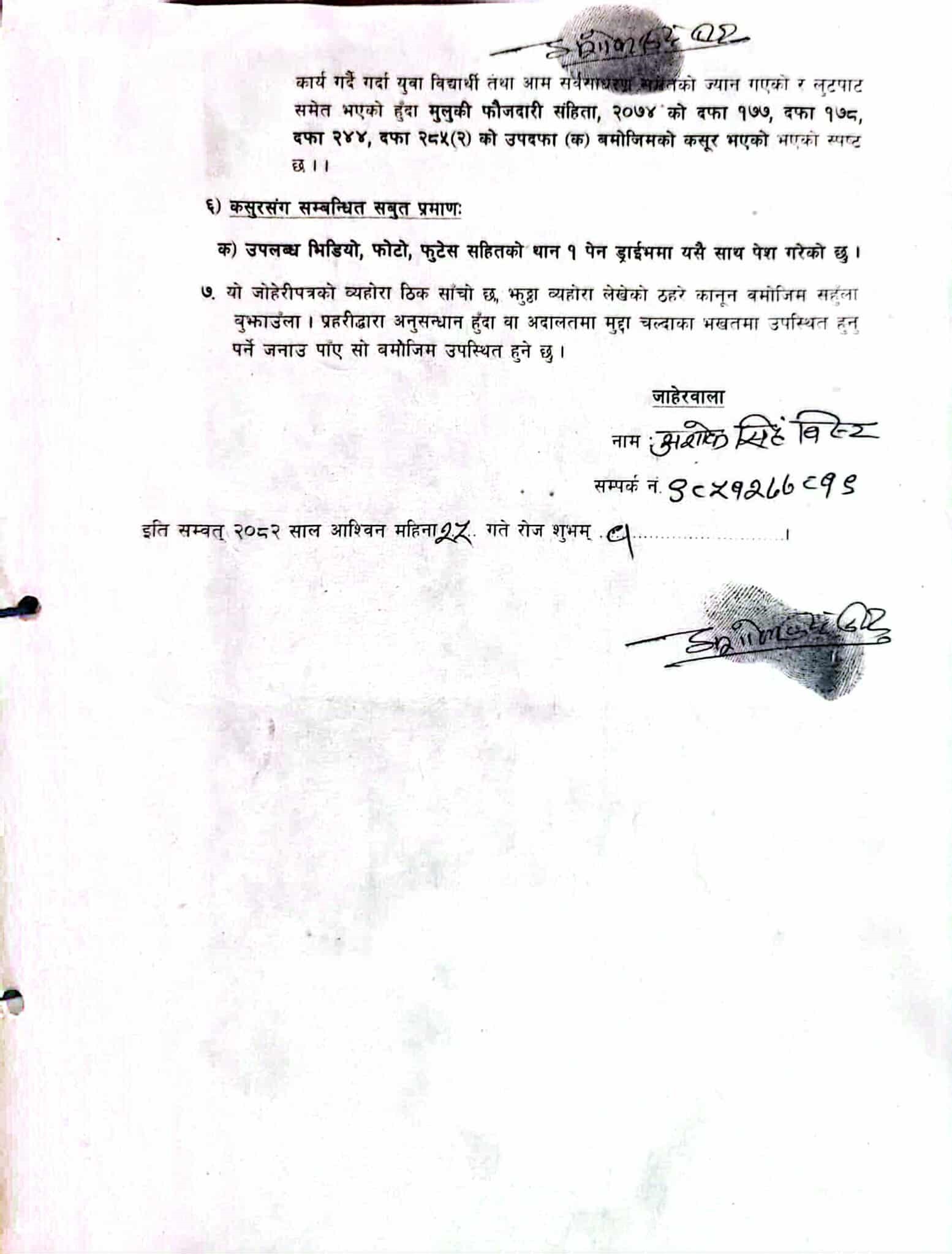 नेपाल प्रेससँग कुरा गर्दै बिष्टले संगठनको निर्णयअनुसार आफूले काठमाडौं र ललितपुरमा जाहेरी दिएको बताए । जाहेरी दर्ता भने भएको छैन । प्रहरीले सरकारी वकिल कार्यालयसँग सल्लाह गरेर निर्णय लिने बताएका थिए । यसअघि पनि यस्तै प्रकृतिका जाहेरी आएको हुँदा सबैलाई एउटै कारवाही प्रक्रियामा लगिने प्रहरीको भनाइ थियो ।