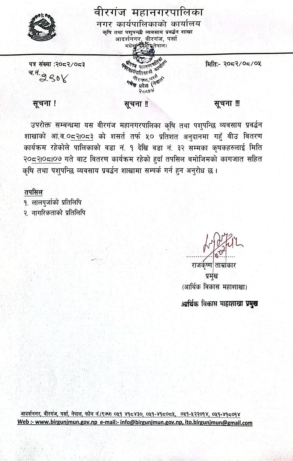 वीरगन्ज महानगरपालिकाले स्थानीय किसानलाई प्रत्यक्ष लाभ पुग्ने उद्देश्यसहित ५० प्रतिशत अनुदानमा बीउ वितरण कार्यक्रम आजदेखि औपचारिक रूपमा सुरु गरेको छ। महानगरको कृषि तथा पशुपन्छी विकास प्रवर्द्धन शाखामार्फत सञ्चालन हुने यो कार्यक्रमले महानगरपालिकाभित्रका १ देखि ३२ नं। वडाका किसानलाई बीउ तथा कृषिजन्य सामग्री सहज रूपमा उपलब्ध गराउने लक्ष्य राखेको छ।