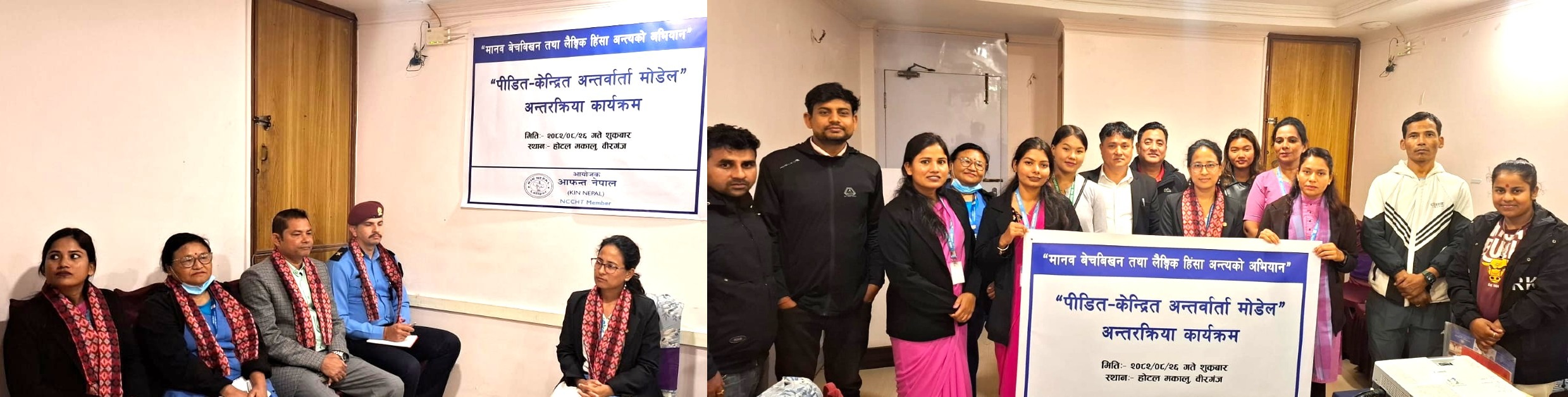 आफन्त नेपाल पर्साको आयोजनामा शुक्रबार वीरगञ्जमा पीडित–केन्द्रित अन्तर्वार्ता मोडेल अन्तरक्रिया कार्यक्रम सम्पन्न भएको छ। “मानव बेचबिखन तथा लैङ्गिक हिंसा अन्त्यको अभियान” नारासहित सञ्चालन गरिएको कार्यक्रमले पीडितको आवाज, अधिकार र सहयोग प्रक्रियालाई सुदृढ बनाउने उद्देश्य बोकेको थियो।कार्यक्रम संस्थाकी अध्यक्ष कविता यादवको अध्यक्षता तथा वीरगञ्ज महानगरपालिकाका उप–मेयर ईम्तियाज आलमको प्रमुख आतिथ्यमा सम्पन्न भएको