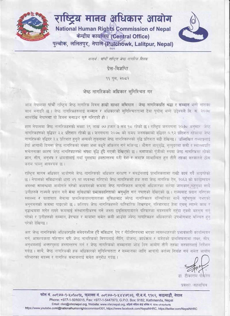 संविधानको धारा ४१ मा व्यवस्था गरिएको ज्येष्ठ नागरिकको हक तथा ज्येष्ठ नागरिक ऐन २०६३ को कार्यान्वयन अवस्था सम्बन्धमा आयोगले गरेको अध्ययनका क्रममा ज्येष्ठ नागरिक आफ्नो अधिकारका बारेमा जानकार नहुनुका साथै उनीहरूले राज्यले प्रदान गर्ने सेवा सुविधाको प्रभावकारिताको अनुभूति गर्न नपाएको देखिएको आयोगका प्रवक्ता डा। टीकाराम पोखरेलले निकालेको विज्ञप्तिमा उल्लेख छ ।