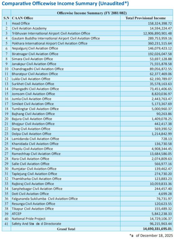उड्डयन प्राधिकरणले देशभरका विमानस्थल लगायतबाट १४ अर्ब ६९ करोड ३ लाख ३१ हजार रुपैयाँ कमाएको छ ।