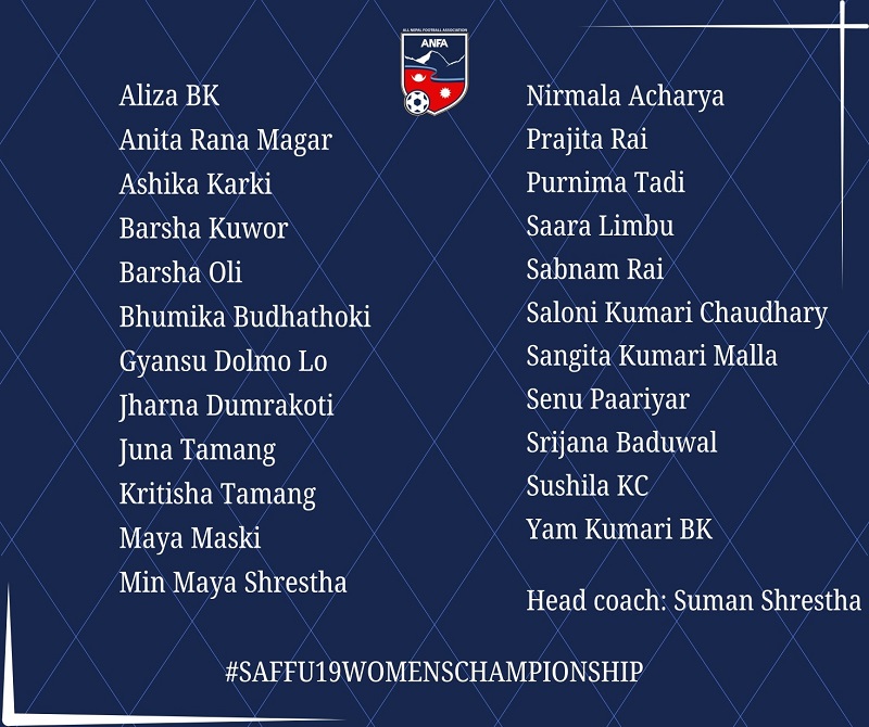 काठमाणडौ – अखिल नेपाल फुटबल सङ्घ ९एन्फा०ले पोखरामा हुने साफ १९ वर्षमुनिको महिला च्याम्पियनशिपका लागि २३ सदस्यीय नेपाली टोली घोषणा गरेको छ । यही माघ १७ देखि २४ गतेसम्म पोखरा रङ्गशालामा हुने च्याम्पियनशिपका लागि एन्फाले २३ सदस्यीय नेपाली टोलीको अन्तिम नामावली घोषणा गरेको हो ।