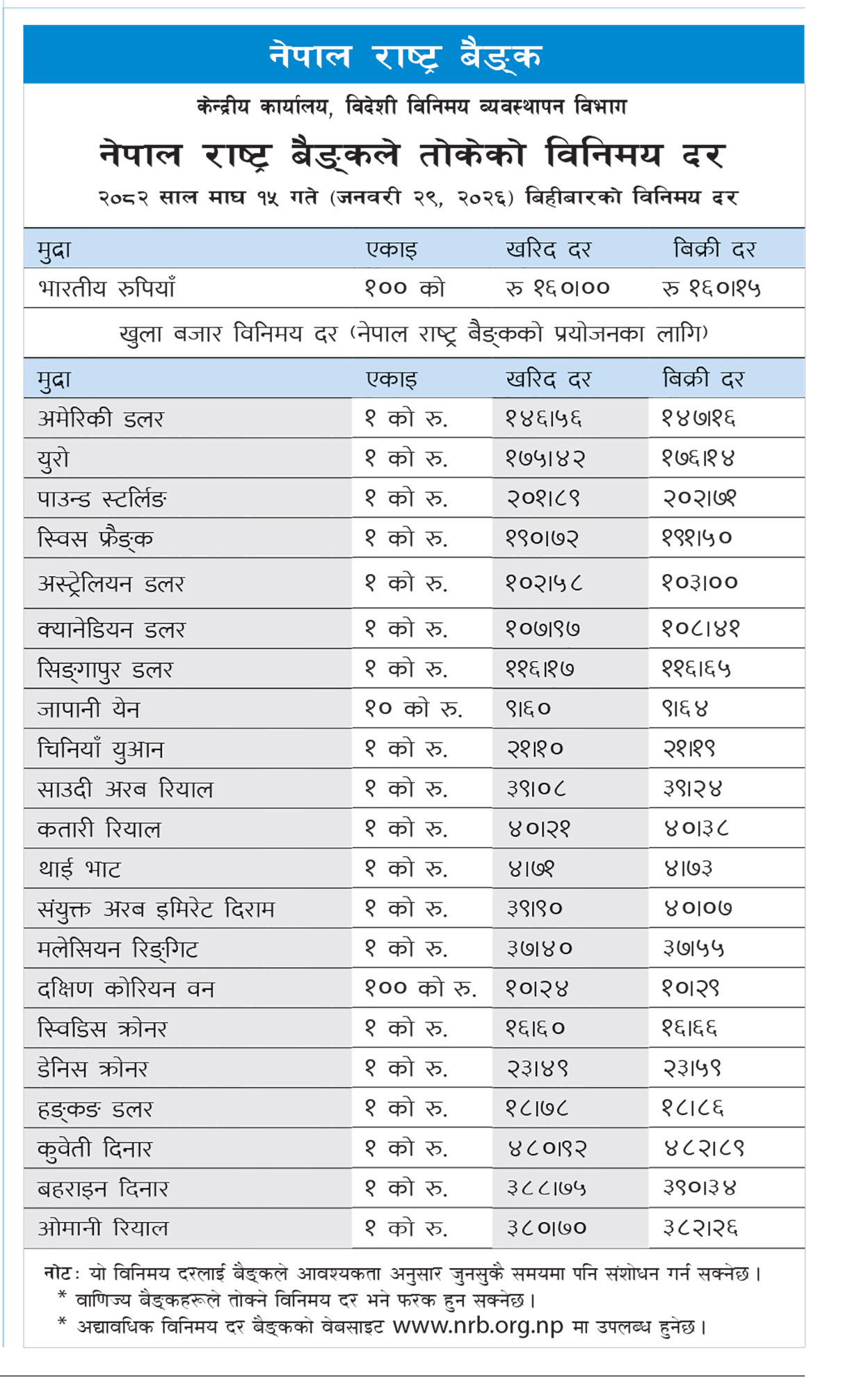 राष्ट्र बैङ्कका अनुसार थाई भाट एकको खरिददर चार रुपैयाँ ७१ पैसा र बिक्रीदर चार रुपैयाँ ७३ पैसा, युएई दिराम एकको खरिददर ३९ रुपैयाँ ९० पैसा र बिक्रीदर ४० रुपैयाँ ०७ पैसा, मलेसियन रिङ्गेट एकको खरिददर ३७ रुपैयाँ ४० पैसा र बिक्रीदर ३७ रुपैयाँ ५५ पैसा, साउथ कोरियन वन १०० को खरिददर १० रुपैयाँ २४ पैसा र बिक्रीदर १० रुपैयाँ २९ पैसा, स्विडिस क्रोनर एकको खरिददर १६ रुपैयाँ ६० पैसा र बिक्रीदर १६ रुपैयाँ ६६ पैसा र डेनिस क्रोनर एकको खरिददर २३ रुपैयाँ ४९ पैसा र बिक्रीदर २३ रुपैयाँ ५९ पैसा कायम गरिएको छ ।