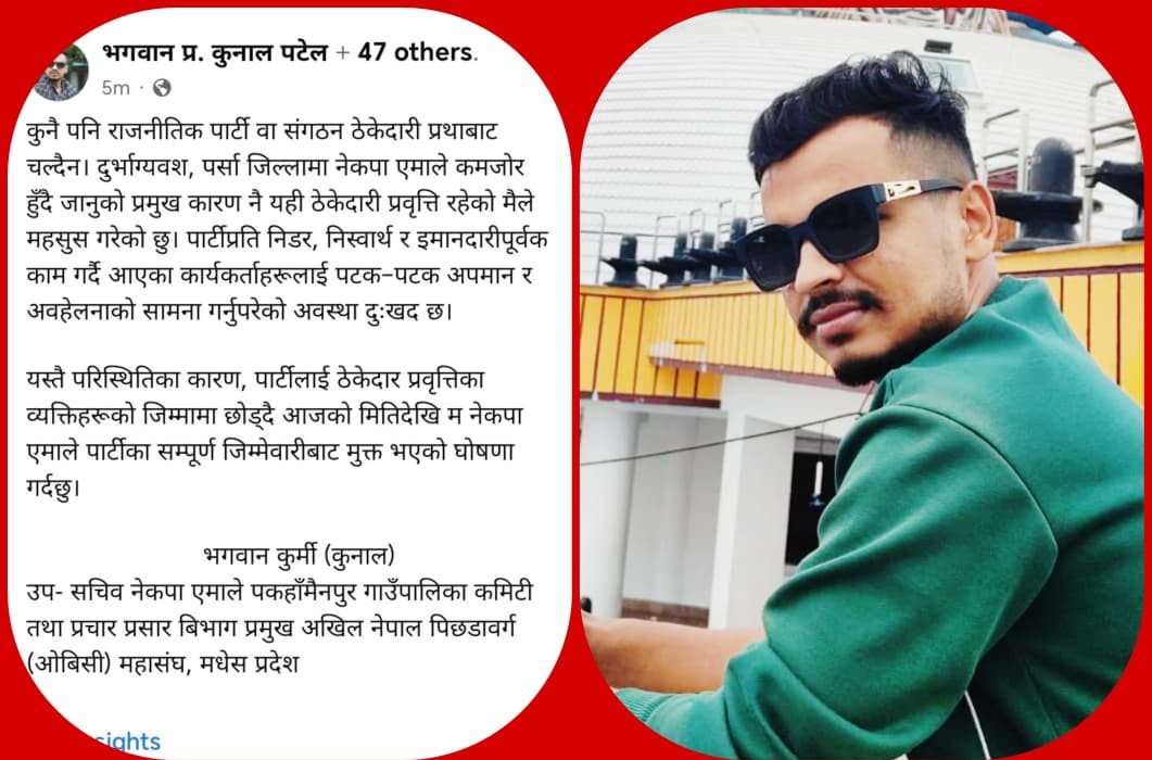 पर्सा— नेकपा एमाले पर्सा जिल्ला भित्र बढ्दै गएको असन्तुष्टि फेरि एकपटक सतहमा आएको छ। पकहामैनपुर गाउँपालिका कमिटीका उप–सचिव तथा अखिल नेपाल पिछडावर्ग (ओबिसी) महासंघ मधेश प्रदेशका प्रचार–प्रसार विभाग प्रमुख भगवान कुर्मी (कुन्नाल) पटेलले नेकप एमालेको सम्पूर्ण जिम्मेवारीबाट मुक्त भएको घोषणा गर्दै पार्टी नेतृत्वमाथि कडा आक्रमण गरेका छन।