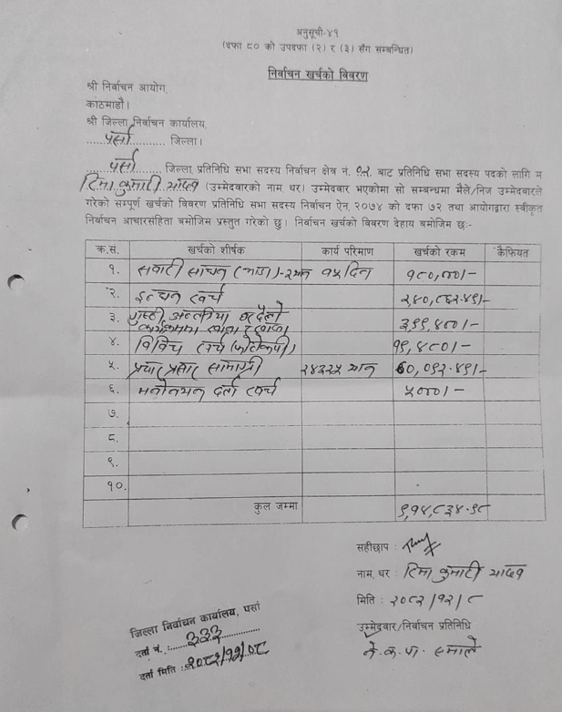 पर्सा–२ की रिमा यादवको चुनावी खर्च सार्वजनिक