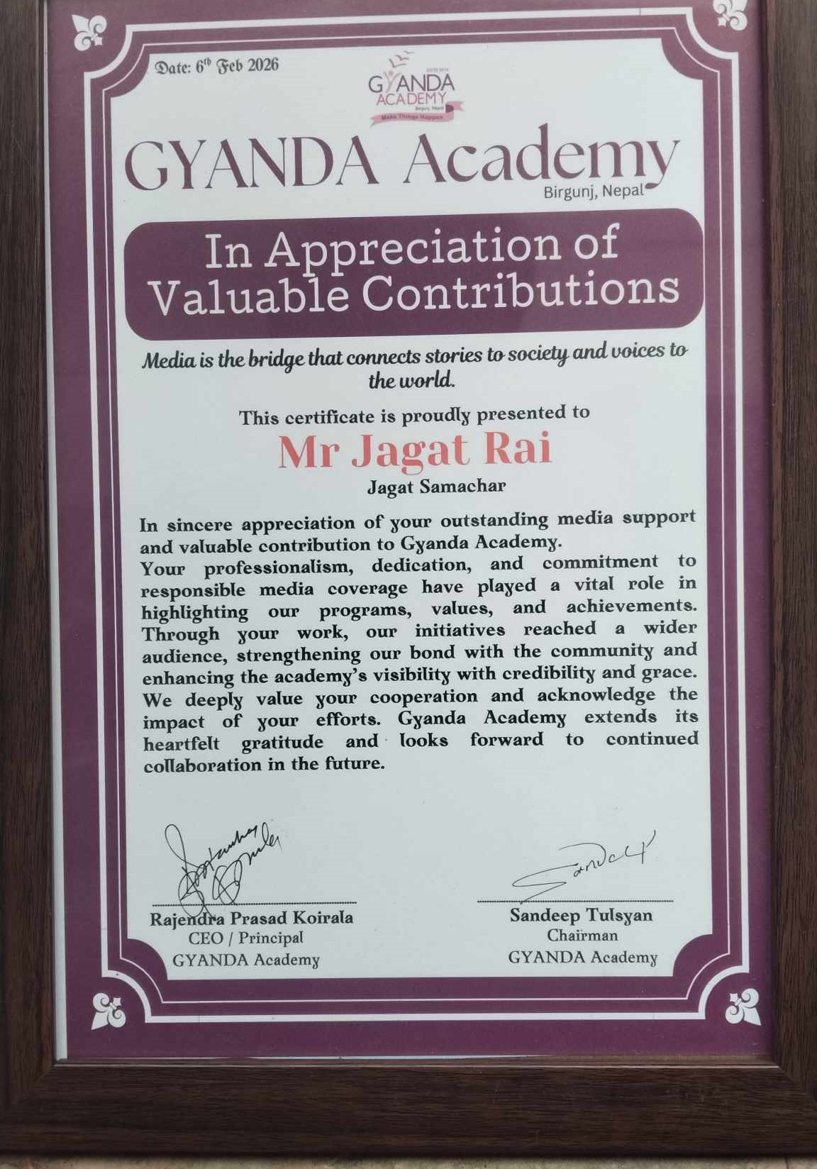 ज्ञान्दा एकेडेमीका सिईओ एवं प्रोफेसर राजेन्द्र कोइरालाद्वारा पत्रकार जगत राई सम्मानित