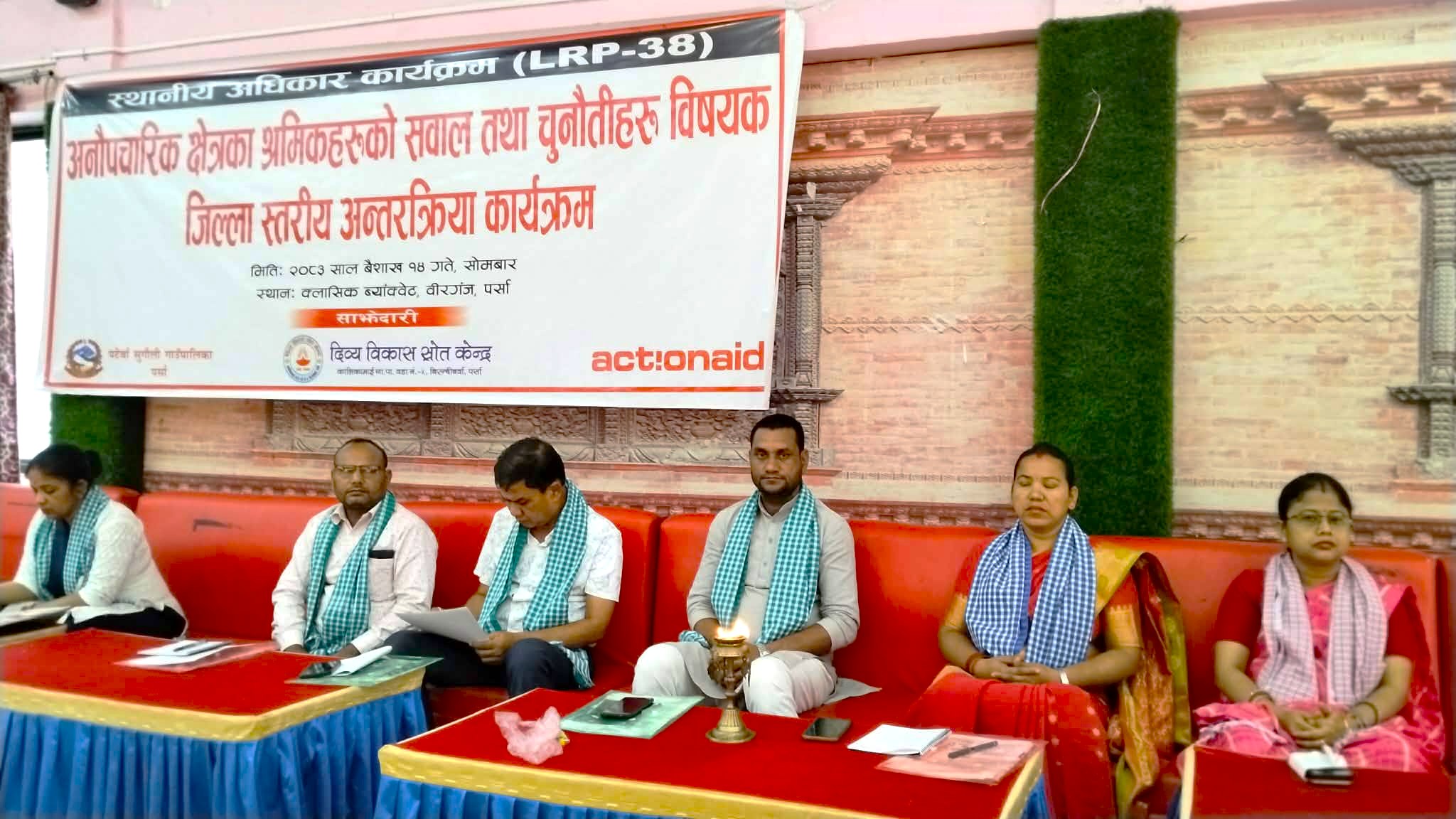 वीरगञ्ज — दिव्य विकास स्रोत केन्द्र, कालिकामाई गाउँपालिका–६ बिरन्चिबर्वा (पर्सा) को आयोजना तथा पटेर्वा सुगौली गाउँपालिका र एक्सन एडको साझेदारीमा हिजो (सोमबार) “स्थानीय अधिकार कार्यक्रम( LRp-38) अन्तर्गत अनौपचारिक क्षेत्रका श्रमिकहरूको सवाल तथा चुनौतीहरू विषयक जिल्ला स्तरीय अन्तरक्रिया कार्यक्रम सम्पन्न भएको छ।
