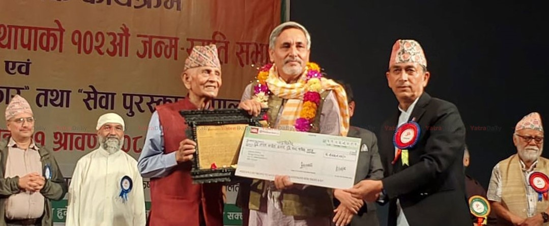 कर्मयोगी बद्रीविक्रम थापा स्मृती सेवा गुठीद्वारा शनिवार काठमाण्डौस्थित नेपाल प्रज्ञा प्रतिष्ठानमा आयोजित कर्मयोगी बद्रीविक्रम थापाको १०२ औं जन्म स्मृति सभा एवं बद्रीविक्रम राष्ट्र गौरब पुरस्कार तथा सेवा पुरस्कार वितरण कार्यक्रमका अवसरमा झा पुरस्कृत भएका हुन् ।